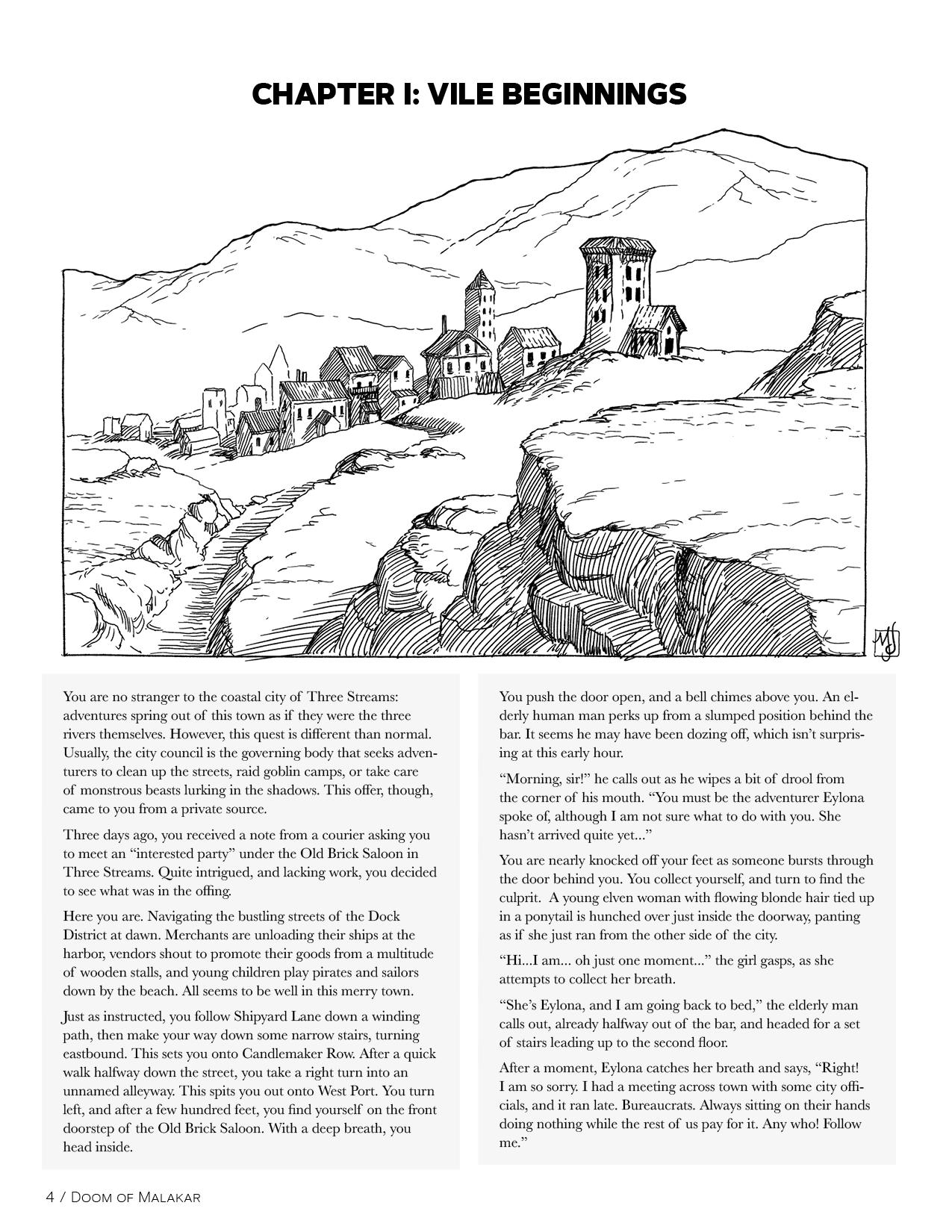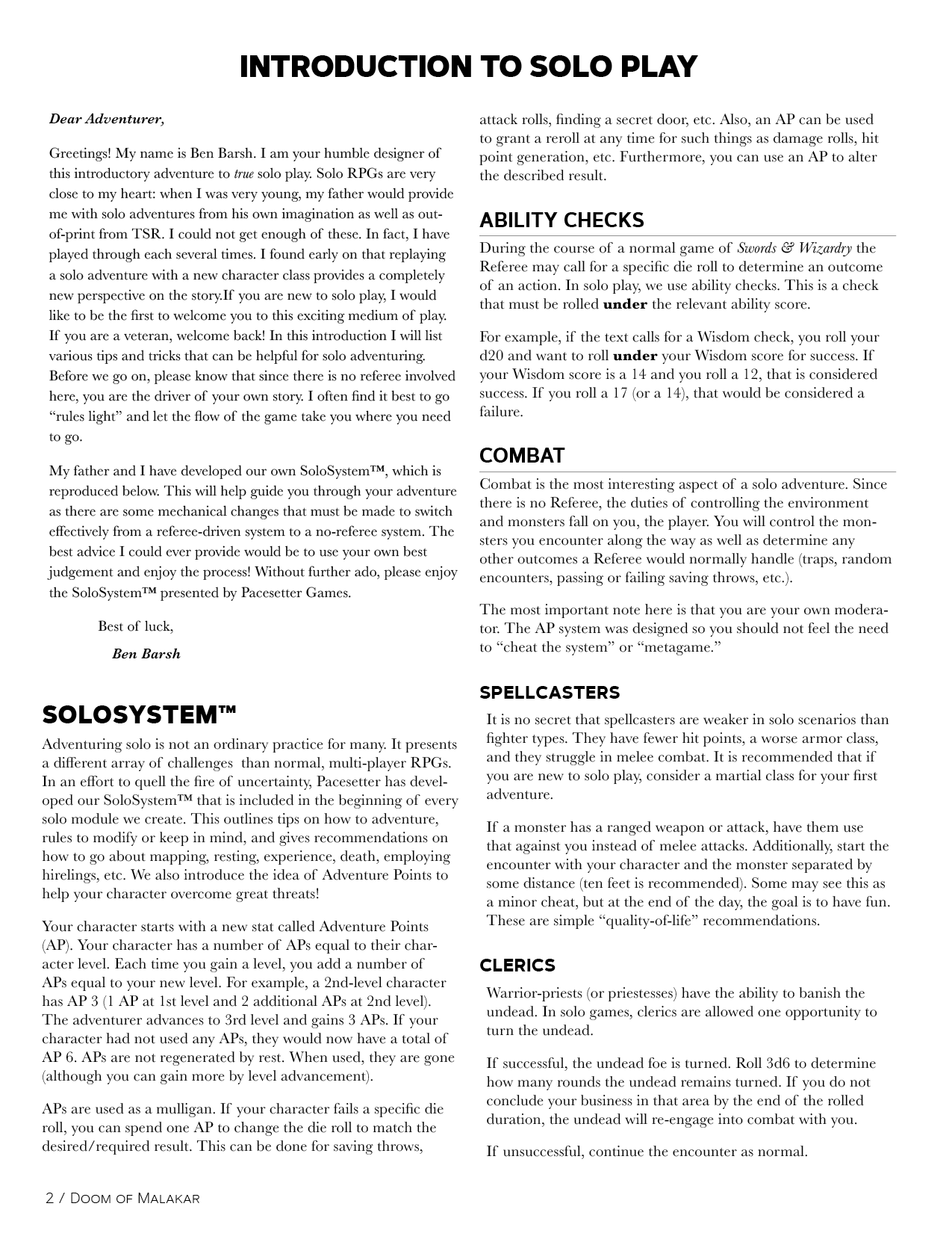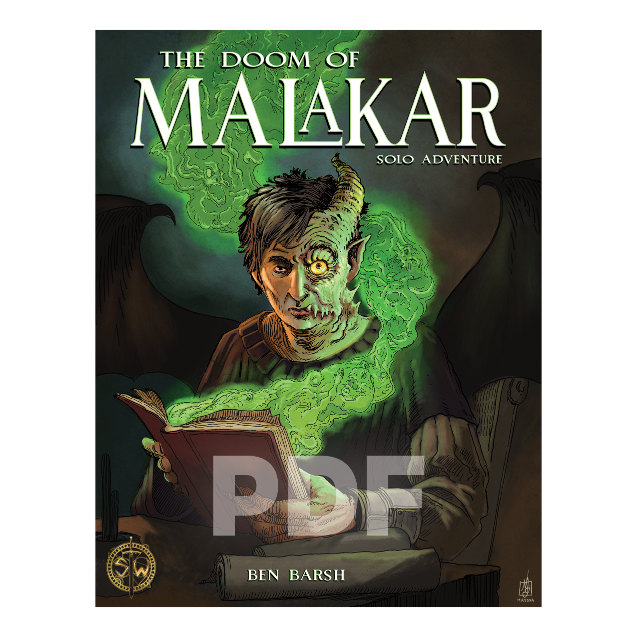 The Doom of Malakar is a solo adventure for Swords & Wizardry written by Ben Barsh, which takes your Swords & Wizardry character into a deadly quest to discover what happened to a rogue magic-user by the name of Malakar. You’ll need the Swords & Wizardry rules to play through the adventure, but what you won’t need is another player. All you need is yourself, to delve into the mysterious events surrounding the ill-fated town of Squall’s End, a sinister plot put into motion by the demon Zulggroz, and the Inn of the Shrouded Stag!